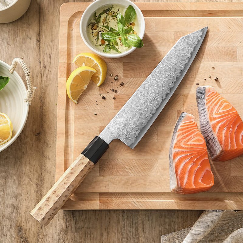 Handcrafted from 49 layers of Damascus steel with a Blue 2 steel core, this Bunka delivers razor-sharp precision, exceptional durability, and long-lasting edge retention. The layered pattern enhances both strength and beauty, making each blade unique.