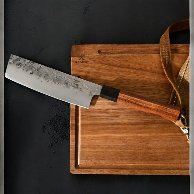 At Kaamut®, we use only the highest quality materials. This handcrafted knife is made from premium 5Cr carbon steel with an impressive hammered finish. The rosewood and ebony handle not only adds a refined finish but also provides a comfortable grip during use. We believe this Nakiri knife will become a beloved addition to your kitchen, inspiring you to create beautiful dishes.
