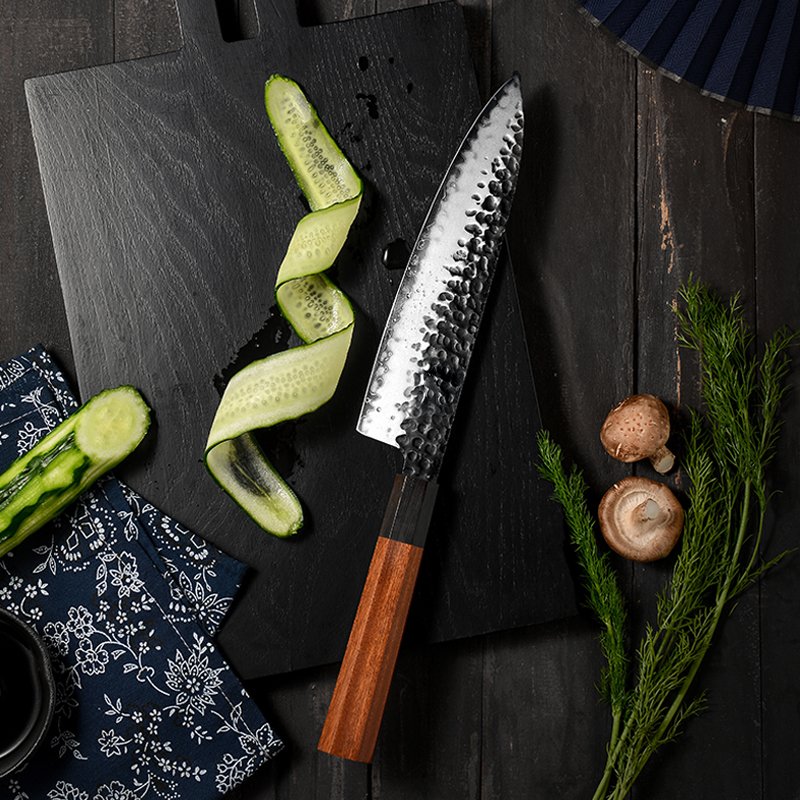 The hammered finish prevents food from sticking to the blade and adds a striking visual effect. Combined with the deep black coating, this knife not only delivers superb performance but also stands out as a bold design piece in your kitchen.