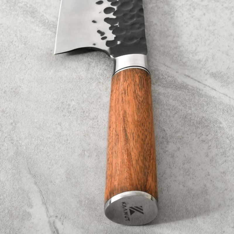 At Kaamut®, we use only the finest materials. This handcrafted knife is made from premium 5Cr carbon steel, with an impressive hammered finish. The rosewood handle not only provides a refined appearance but also ensures a comfortable grip while slicing. We believe this Santoku chef’s knife will become a cherished addition to your kitchen and inspire you to create beautiful dishes.