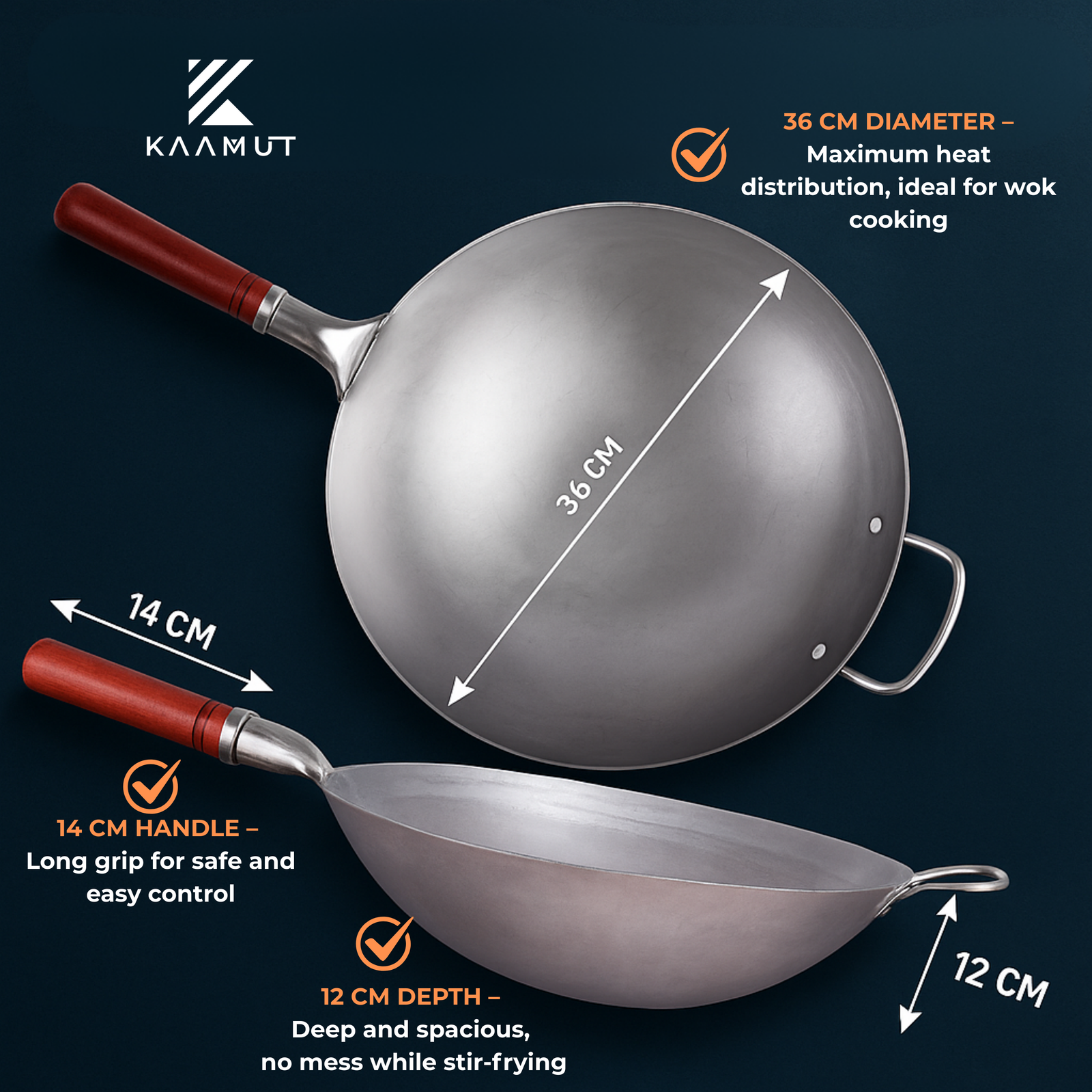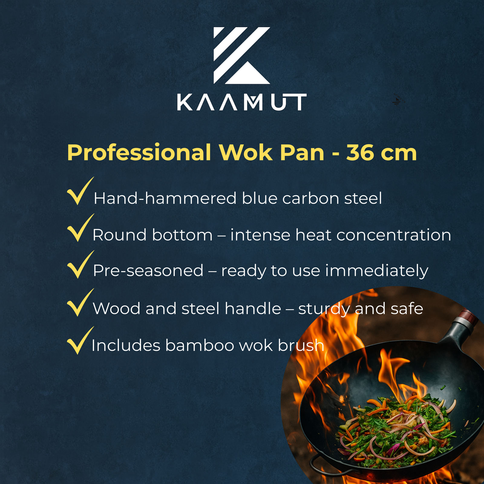 At KAAMUT®, we are committed to the highest quality and craftsmanship in all our products. Our Professional Hand-Hammered Wok 36 cm is carefully crafted and pre-seasoned, so you can immediately enjoy an authentic cooking experience without any extra steps. With attention to detail and a desire to elevate your cooking experience, this wok is an indispensable tool in every kitchen.