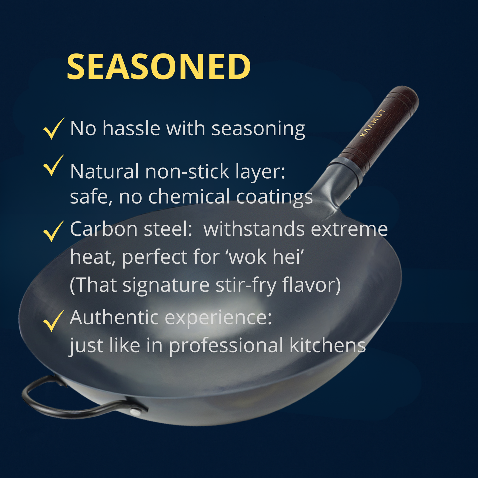 - Pre-Seasoned: The wok is pre-seasoned, so you can start cooking right away. The natural non-stick layer has been created through a careful oiling process, ensuring your dishes cook to perfection.
