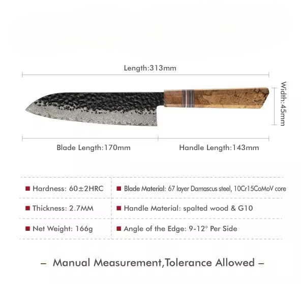 The hammered black Damascus finish reduces friction, prevents food from sticking, and adds an artisanal touch. Paired with the ergonomic Spalted Maple & G10 handle, the knife provides a secure grip, superior comfort, and excellent balance, even during extended use.