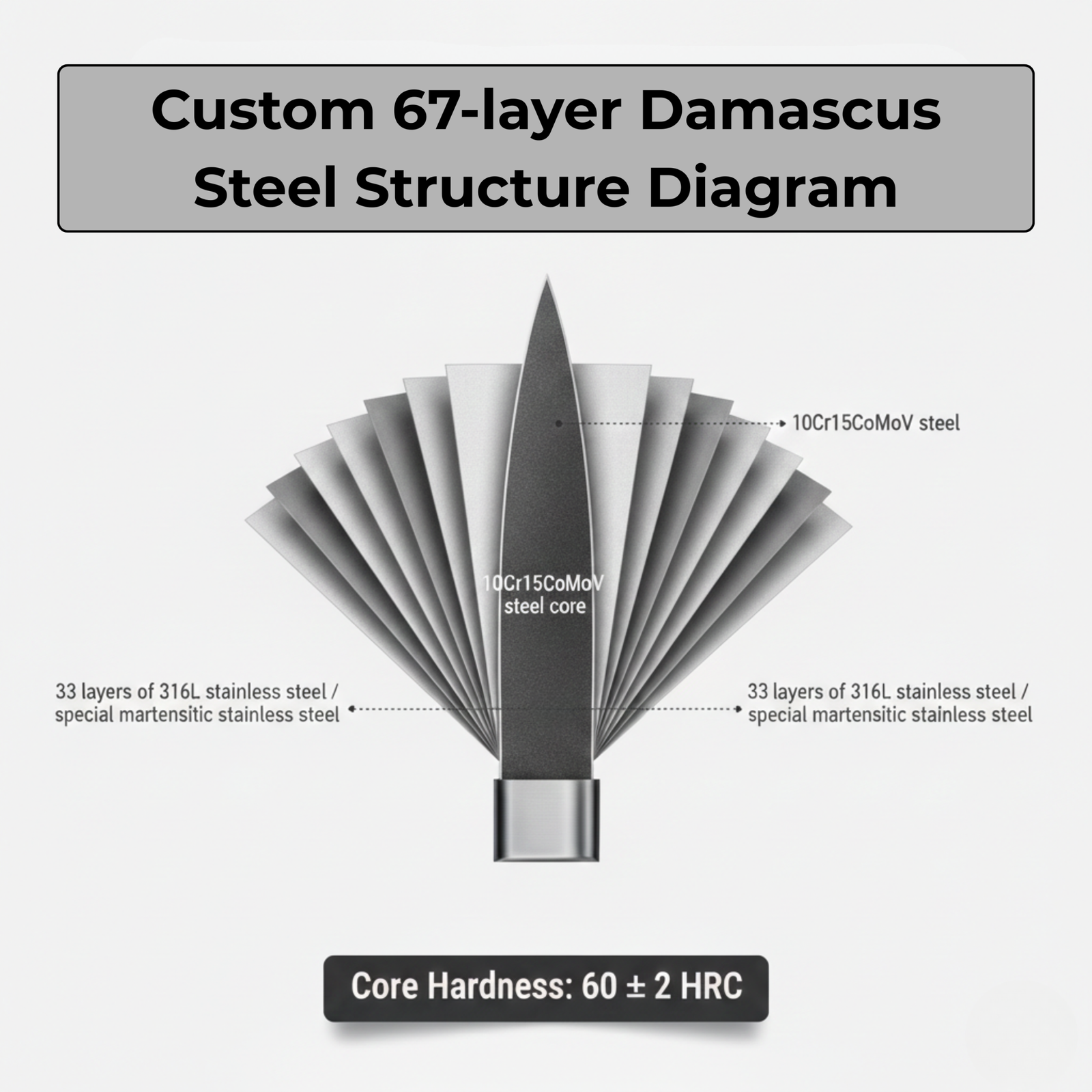 - 67 layers of Damascus steel with a 10Cr15CoMoV core, hardness 60±2 HRC
