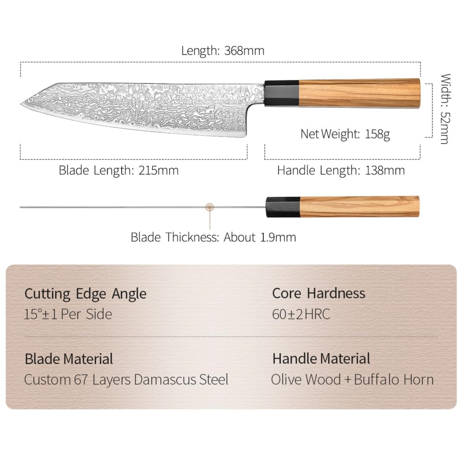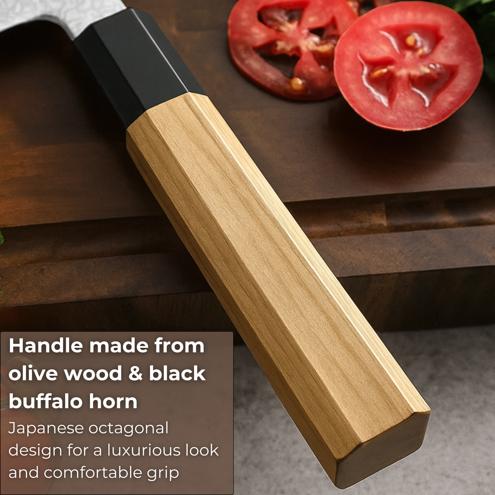 The Japanese octagonal handle of olive wood and black buffalo horn combines luxury aesthetics with ergonomic design and grip, ensuring safe and comfortable use even during extended cooking sessions. Whether julienning vegetables, chopping ingredients, or creating precise garnishes, this knife is your reliable kitchen companion.